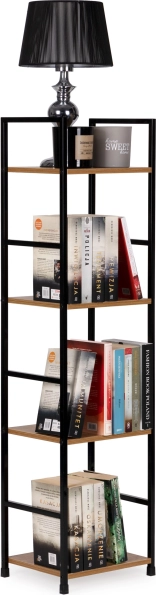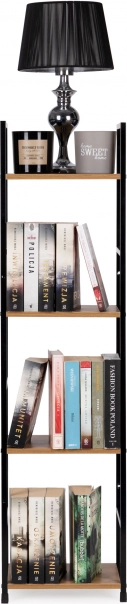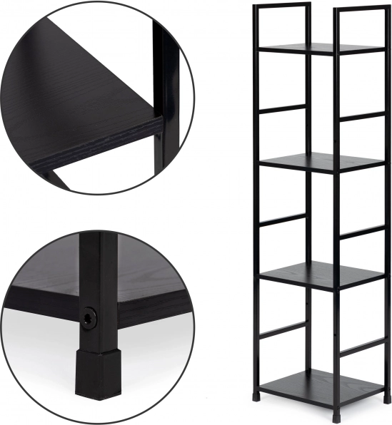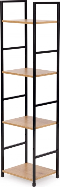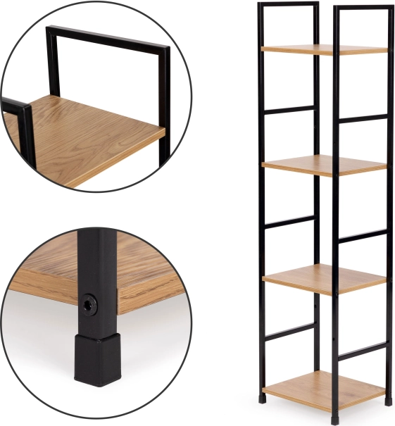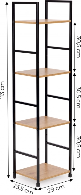 Ta nowoczesna biblioteczka w stylu loft łączy proszkowo lakowany metal i półki z MDF w dekorze drewna. Wysokość 112 cm i kompaktowy rzut świetnie sprawdzą się w mniejszych przestrzeniach, maksymalnie wykorzystując miejsce na książki, dekoracje, rośliny czy dodatki łazienkowe. Każda półka ma wymiary 23,5 × 29 cm, a odstęp między półkami wynosi 31 cm, dzięki czemu wygodnie przechowasz wszystko, co chcesz mieć pod ręką.