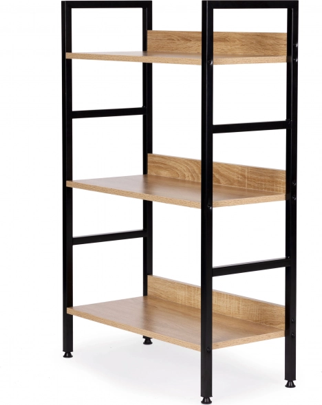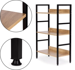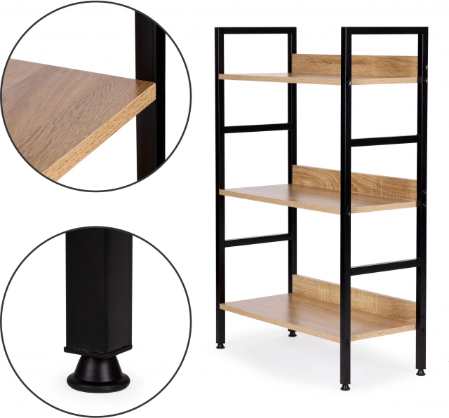 Stylowa półka loftowa z trzema poziomami łączy nowoczesny design, stabilną metalową konstrukcję i uniwersalne zastosowanie w salonie, sypialni, przedpokoju i łazience. Wysokiej jakości płyty MDF z dekorem drewna na solidnej ramie malowanej proszkowo, regulowane nóżki z ochroną podłogi oraz łatwy montaż czynią z niej idealne rozwiązanie do przechowywania dekoracji, książek i roślin.