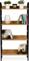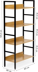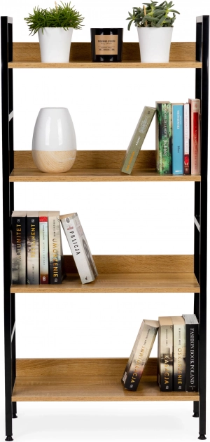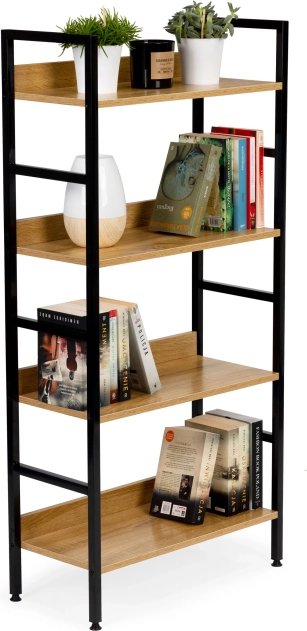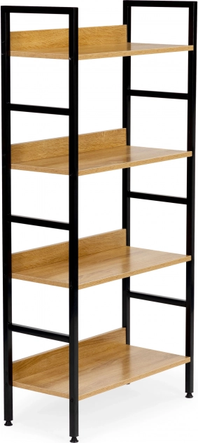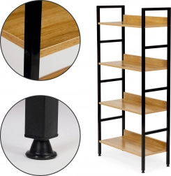 Stylowy regał w stylu loft łączący drewno i metal wprowadzi do wnętrza porządek i dobry design. Oferuje 4 przestronne półki z płyty MDF z dekorem drewna, stabilną metalową ramę z lakierem proszkowym oraz regulowane nóżki z ochronnymi stopkami. Dzięki kompaktowym wymiarom idealnie sprawdzi się w salonie, sypialni, przedpokoju i łazience, a dla maksymalnego bezpieczeństwa można go przymocować do ściany.