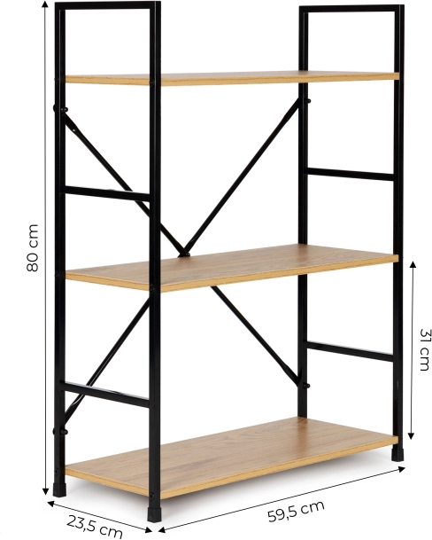Konstrukcja wykonana jest z wytrzymałego metalu malowanego proszkowo, a półki z płyty MDF z wykończeniem imitującym drewno. Każda półka ma wymiary 59,5 x 23,5 cm, a odległość między półkami wynosi 31 cm, co zapewnia odpowiednią przestrzeń do przechowywania.