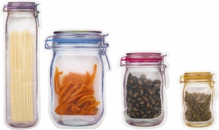 Zestaw 20 woreczków ze sznurkiem do bezpiecznego przechowywania żywności. Oryginalny kształt z nadrukiem słoików. Komplet zawiera aż 4 różne rozmiary do pakowania mniejszych i większych porcji.