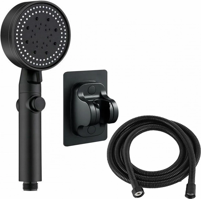 Słuchawka prysznicowa w kolorze czarnym. Przeznaczona do montażu na standardowym wężu prysznicowym. Ręczna słuchawka ma funkcję wyboru trybu strumienia (5) oraz funkcję STOP do zatrzymania przepływu. Wbudowany wentylator zwiększa siłę strumienia bez zwiększania zużycia wody. Dostarczana z dedykowanym wężem prysznicowym o długości 150 cm oraz uchwytem ściennym mocowanym taśmą samoprzylepną.