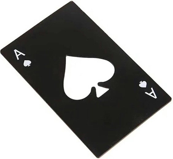 Stalowy otwieracz do butelek w oryginalnym kształcie karty – as pik. Niezwykle wytrzymały gadżet, który dzięki kompaktowym wymiarom mieści się w portfelu. Świetnie sprawdzi się jako drobny prezent lub kuchenny niezbędnik.