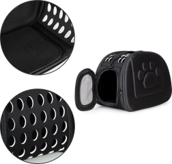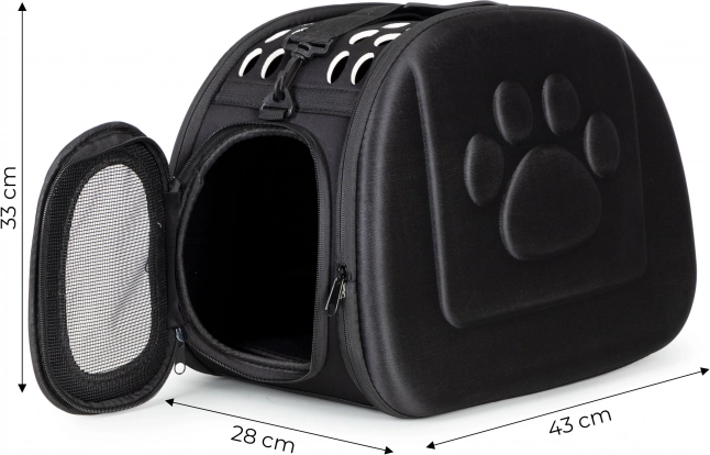Transporter jest wyposażony w ergonomiczną rączkę oraz odpinany regulowany pasek, które ułatwiają noszenie. Dzięki możliwości otwierania z obu stron zapewniony jest łatwy dostęp do pupila oraz do czyszczenia transportera. Otwory wentylacyjne zapewniają odpowiedni dopływ powietrza i komfort podczas transportu.