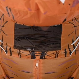 Przedni zamek dla łatwego przebrania, przyszyte rękawice przeciw zgubieniu oraz przezroczyste okienko pod pyskiem dla dobrego pola widzenia.