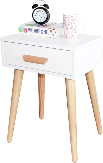 Czyste linie, biel i naturalne drewno nóg wnoszą do pomieszczenia świeżość i lekkość. Idealny jako stolik nocny lub pomocniczy.