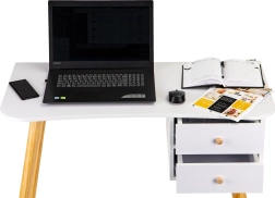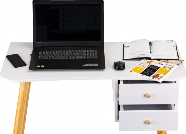 Biały blat i naturalne drewno tworzą nowoczesny wygląd, który pasuje do biura, pokoju ucznia i sypialni – spokojny, funkcjonalny i ponadczasowy.