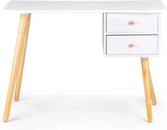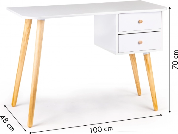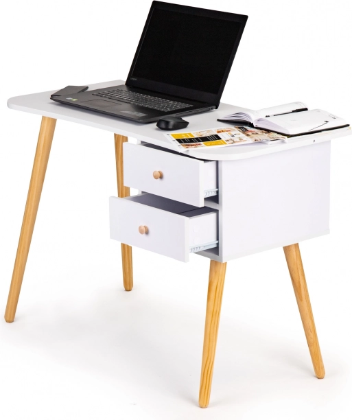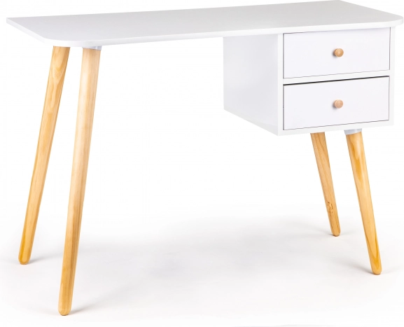 Stylowe biurko ModernHome wyróżnia się minimalistycznym skandynawskim designem, doskonale wpisującym się w nowoczesne wnętrza. Nogi z sosny w naturalnym wykończeniu harmonijnie współgrają z białym blatem i zapewniają wytrzymałość oraz stabilność. Praktyczne dwie szuflady pomogą utrzymać dokumenty, zeszyty i drobiazgi zawsze pod ręką.
