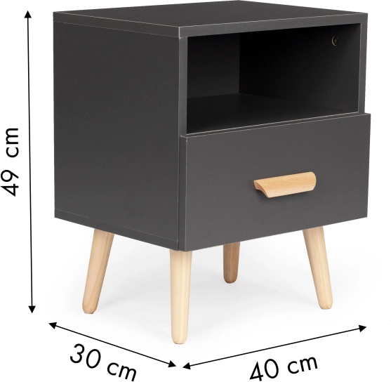 Funkcjonalny podział z jedną szufladą i otwartą półką zapewnia miejsce na książki, telefon, budzik oraz drobiazgi, które chcesz mieć pod ręką. Odporne laminowane powierzchnie łatwo się czyści, a solidna konstrukcja gwarantuje długotrwałą stabilność.