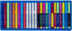 Obrazek pokazuje zestaw kolorowych flamastrów posegregowanych w niebieskiej plastikowej przegródce. Różne kolory i nasadki wskazujące kolor tuszu oferują szerokie możliwości kreatywności.< >