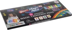 < >/div> <Obrazek pokazuje opakowanie '25 Niesamowitych Magicznych Flamastrów Zmieniających Kolory.' Opakowanie podkreśla żywe kolory i specjalny efekt zmiany kolorów, uzupełniony ilustracjami i zdjęciami pokazującym i użycie piór.< >