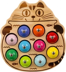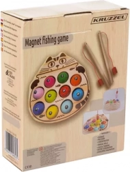 Zestaw zawiera drewnianą planszę w kształcie kotka, 10 magnetycznych rybek i 2 magnetyczne wędki.