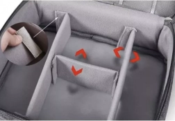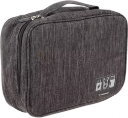 Główna część organizera zawiera regulowane i oddzielone przegródki na różnorodne rodzaje kabli, ładowarek i innych akcesoriów. Przegródki z siatką i gumkami gwarantują, że wszystko pozostanie na swoim miejscu. Z rączką dla łatwego przenoszenia to idealny towarzysz podróży, do biura lub na spotkania.