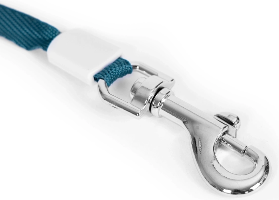 Solidna metalowa sprzączka swobodnie się obraca i zapobiega skręcaniu taśmy. Bezpieczne i szybkie przypięcie do obroży lub szelek.