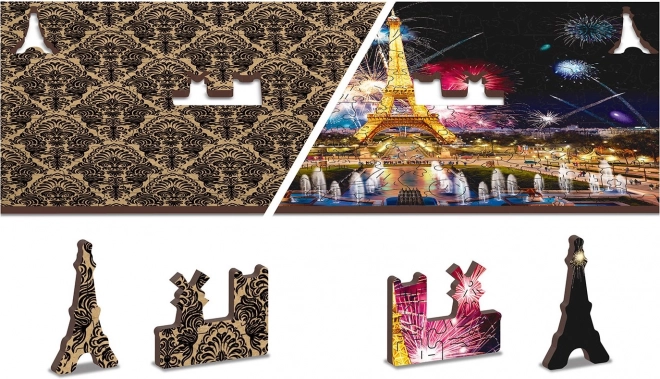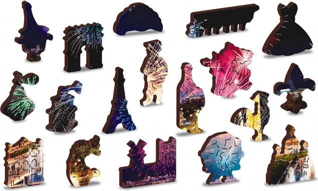 Puzzle są dwustronne (2w1): z jednej strony układasz kolorowy motyw nocnego Paryża z fajerwerkami, z drugiej – powtarzający się wzór wyłącznie według kształtów elementów. Gładkie krawędzie bez drzazg zapewnia precyzyjna obróbka laserowa oraz solidna płyta HDF o grubości 3–4 mm. W zestawie znajdziesz także osobny wzór-podkładkę dla wygodniejszego układania.