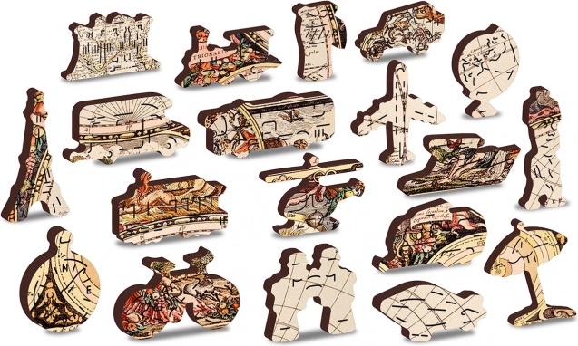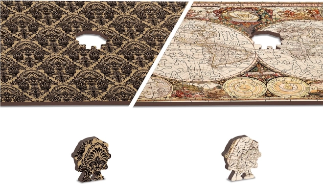 Drewniane puzzle z motywem antycznej mapy ucieszą miłośników oryginalnych układanek i kolekcjonerów nietuzinkowych prezentów. Dzięki dwustronnemu wykonaniu 2w1 możesz układać obraz na awersie lub spróbować ułożyć rewers z powtarzającym się wzorem wyłącznie według kształtów elementów.