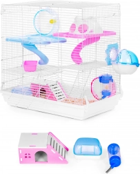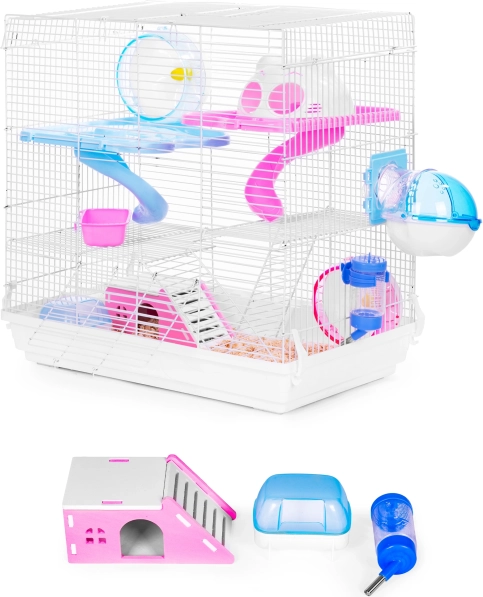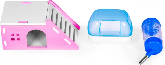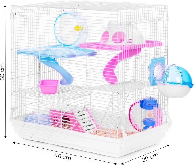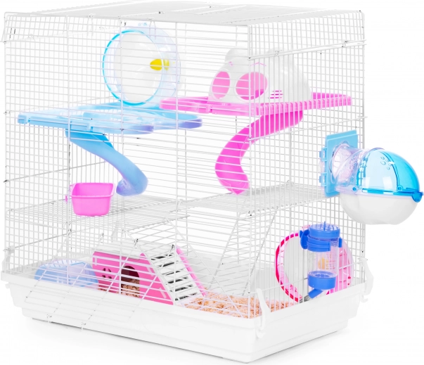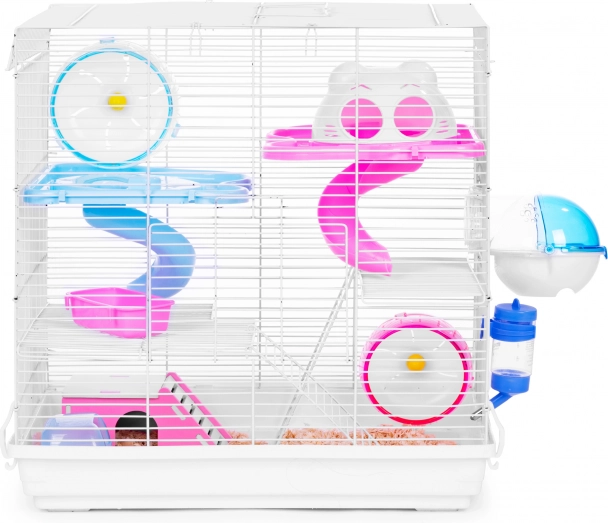W zestawie znajdują się domek, miska, poidełko, dwie zjeżdżalnie, cztery poziomy i kołowrotek – wszystko, czego Twój pupil potrzebuje do komfortu, aktywności i odpoczynku.