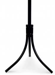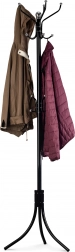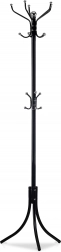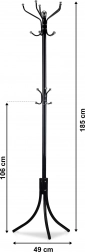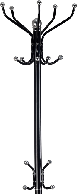 Stylowy wieszak w ponadczasowej czerni to praktyczne rozwiązanie, które pomaga utrzymać porządek w przedpokoju i biurze. Górną część tworzy pięć ramion, z których każde ma dwa uchwyty do wygodnego wieszania odzieży. W środkowej części znajdują się trzy mniejsze haczyki na torebki, szaliki lub parasole. Solidna metalowa konstrukcja oraz stabilna, trójnożna podstawa gwarantują pewność podczas codziennego użytkowania.