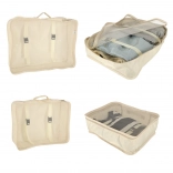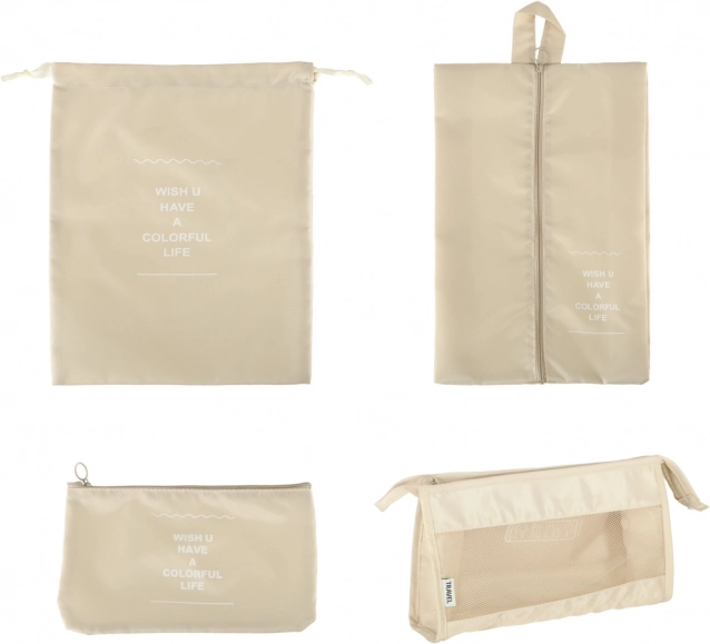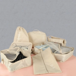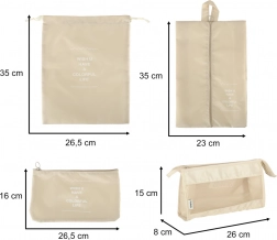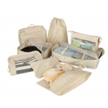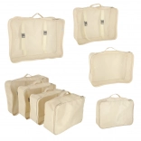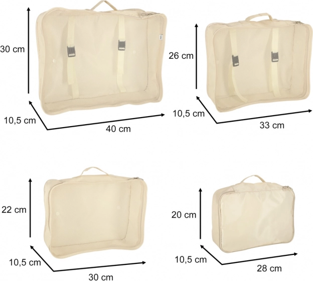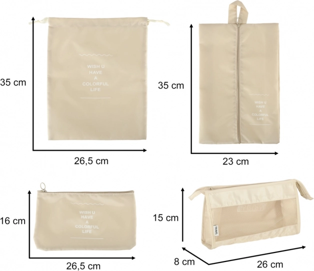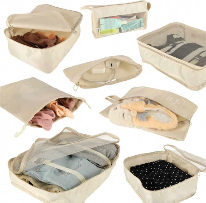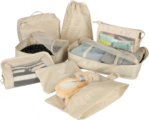 - 8 elementów w jednym zestawie – 4 kostki na odzież (XL, L, M, S), torba na buty, worek ze ściągaczem, kosmetyczka i mała kieszeń.