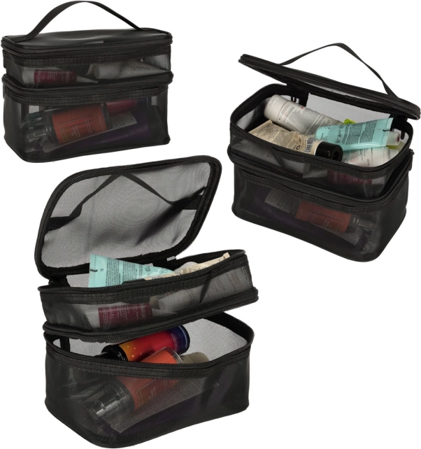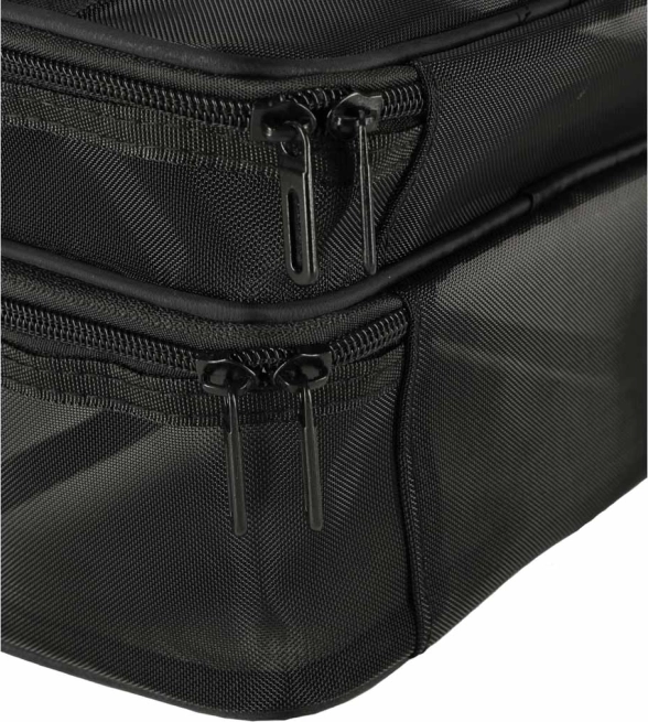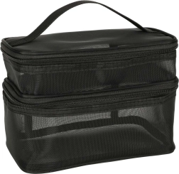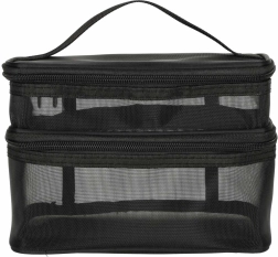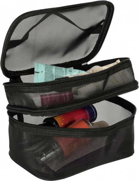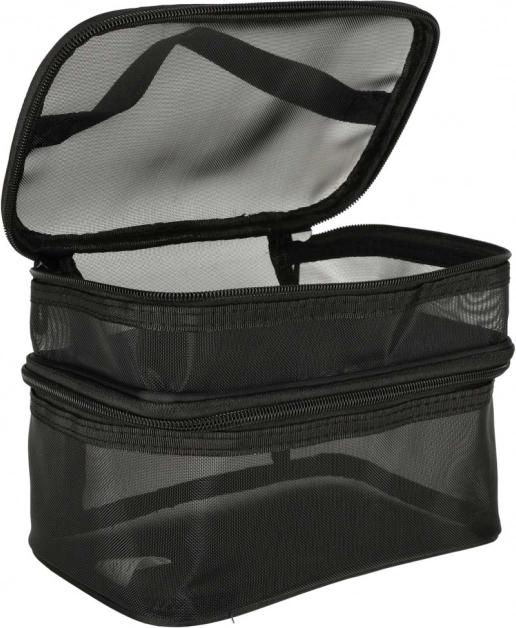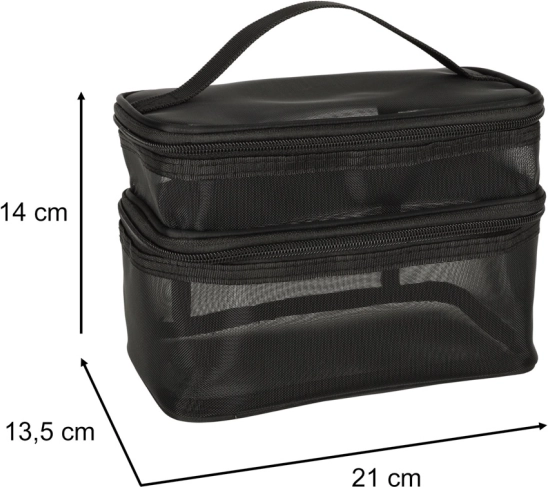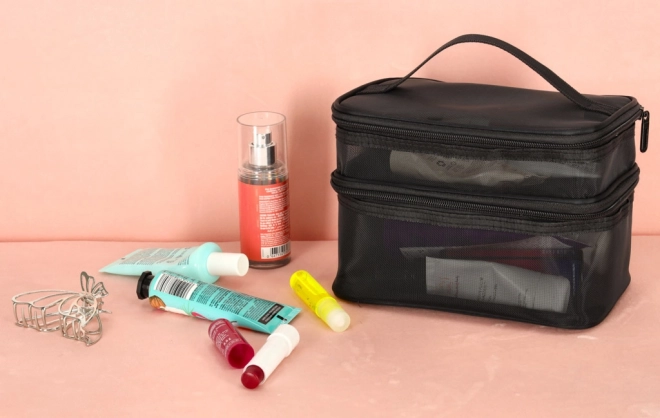 Podróżna kosmetyczka to niezbędnik na każdą wyprawę. Dzięki dwupoziomowej konstrukcji zapewnia uporządkowany przegląd i przechowywanie produktów kosmetycznych. Zamknięcie na dwukierunkowy zamek gwarantuje bezpieczeństwo i wygodę użytkowania. Kosmetyczka wykonana jest z przewiewnego materiału, który pozwala łatwo odnaleźć schowane produkty.
