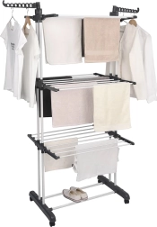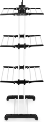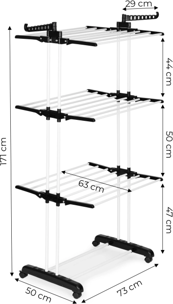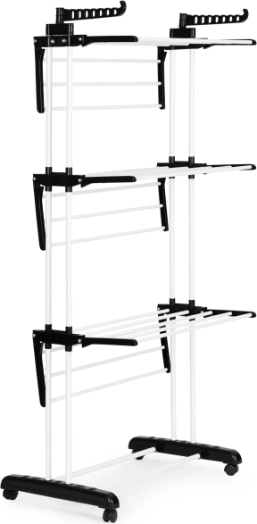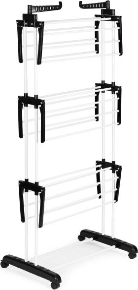 Trzy poziomy z 6 składanymi ramionami oraz 2 uchwytami na wieszaki mieszczą sporą ilość prania, nie zajmując miejsca w pokoju.