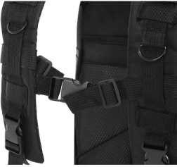 System nośny z profilowanymi szelkami i szybkoodpinanymi klamrami umożliwia natychmiastowe zdjęcie plecaka. Pas piersiowy i odpinany pas biodrowy stabilizują ładunek i odciążają plecy, a paski kompresyjne utrzymują zawartość pewnie na miejscu. Taśmy PALS są kompatybilne z systemem MOLLE do mocowania dodatkowych kieszeni i wyposażenia.