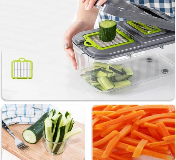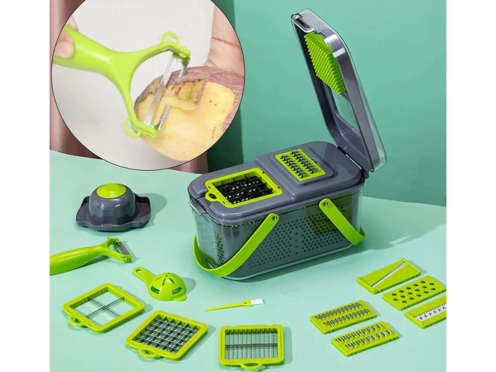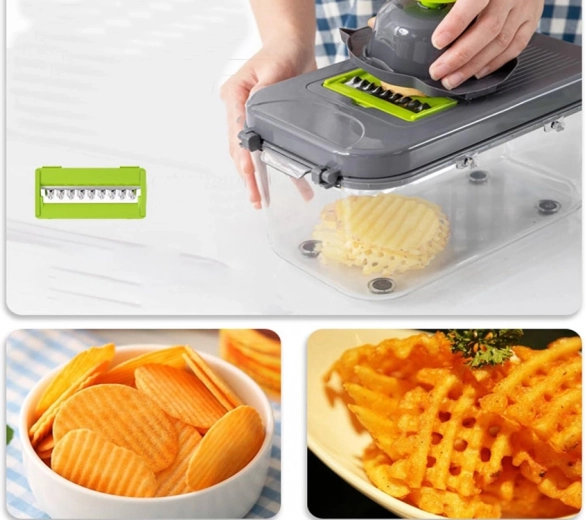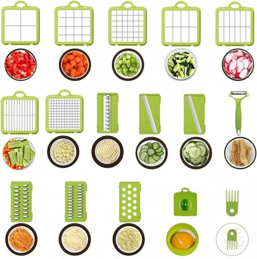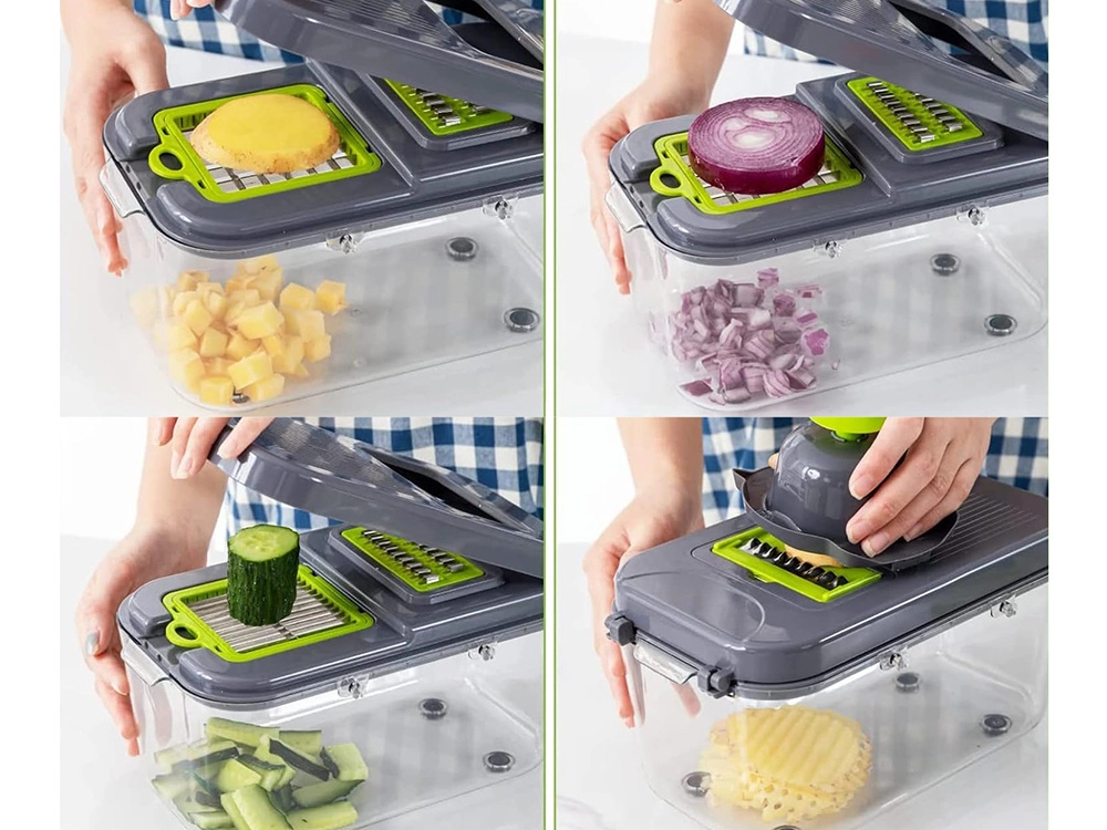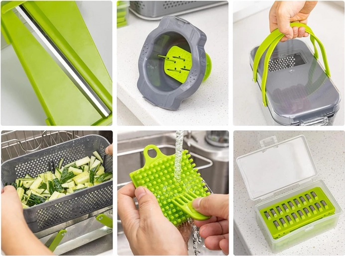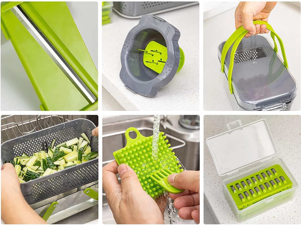 Wymienne wkładki umożliwiają krojenie w plastry, kostkę, paski i słupki, nie brakuje też mandoliny i tarek. Antypoślizgowa podstawa i ochronny uchwyt zwiększają bezpieczeństwo. Pielęgnacja jest prosta – w zestawie znajduje się grzebień czyszczący, a elementy można opłukiwać pod wodą.