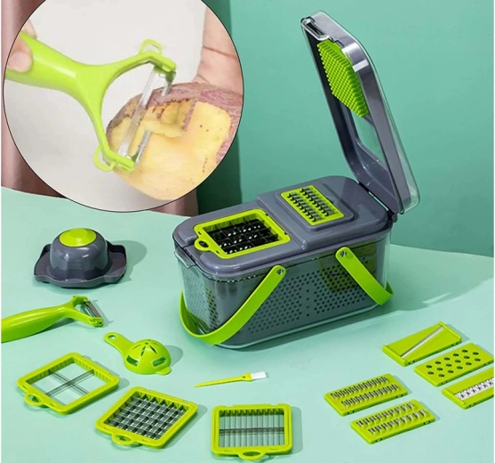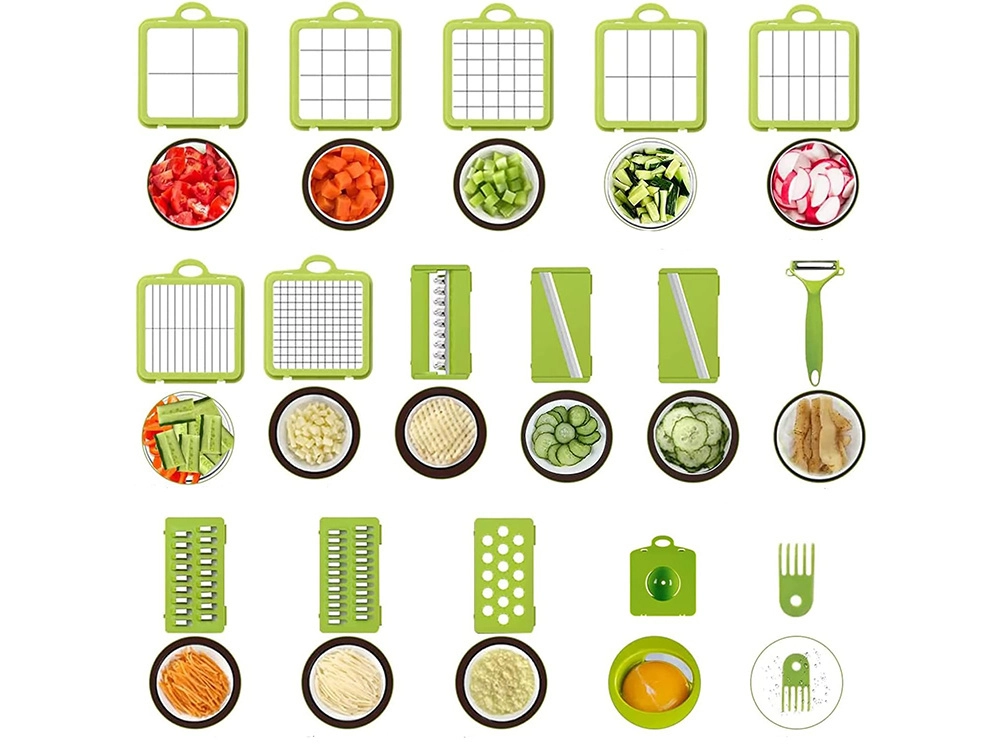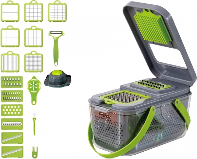 Od plastrów, przez julienne, po kostkę i tarcie – w zestawie znajdziesz siatki, tarki i mandolinę, włącznie z bezpiecznym uchwytem oraz szczoteczką do czyszczenia.