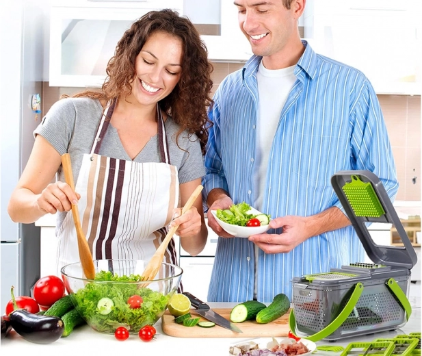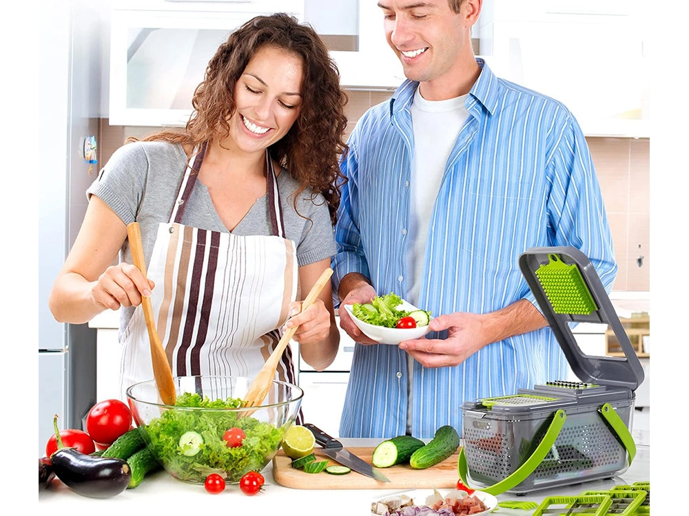Zintegrowany pojemnik zbiera składniki, a niektóre warianty umożliwiają szybkie przepłukanie i odcedzenie, dzięki czemu przygotowanie sałatek jest jeszcze szybsze.