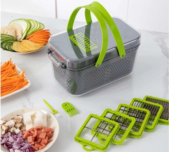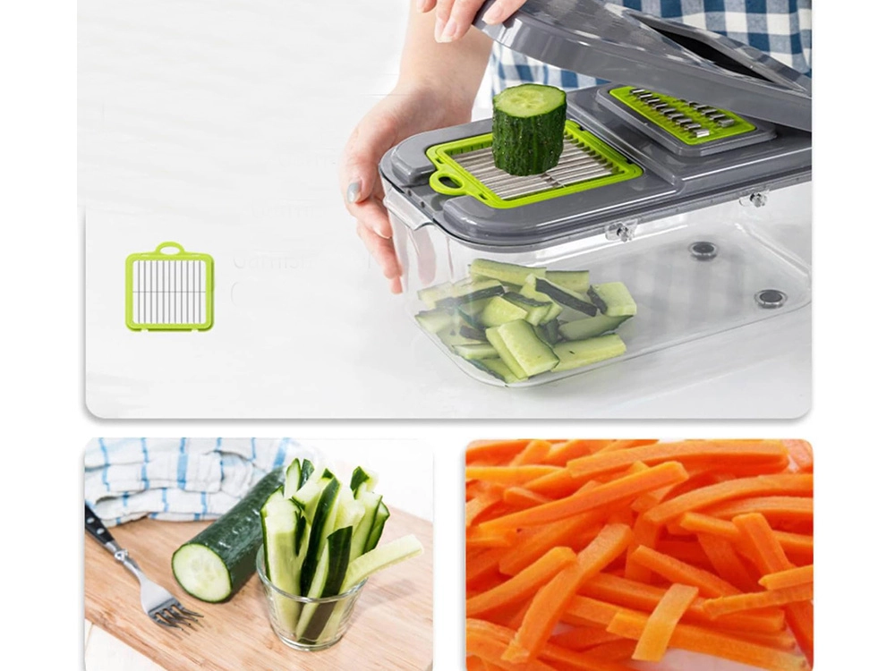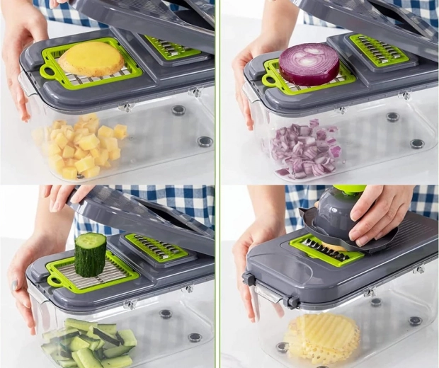 Ta uniwersalna krajalnica oszczędza czas i miejsce w kuchni. W jednym zestawie masz wszystko do szybkiego i precyzyjnego krojenia warzyw, owoców, sera oraz gotowanych jajek. Dzięki zamykanemu pojemnikowi wszystko wpada od razu do środka, blat pozostaje czysty, a porcje są równe.