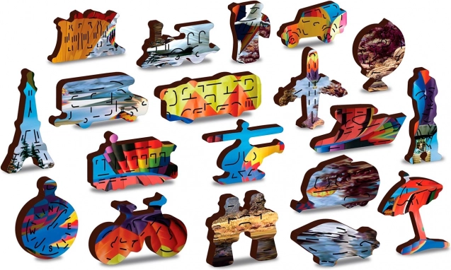Eleganckie i wciągające wyzwanie dla miłośników puzzli. Drewniane puzzle z motywem balonów na gorące powietrze oferują wyjątkowe wrażenia dzięki 61 specjalnie wyciętym elementom w kształcie zwierząt, budowli i przedmiotów. Niektóre z nich można postawić jak małe figurki, co czyni puzzle świetnym prezentem i stylową dekoracją.