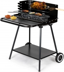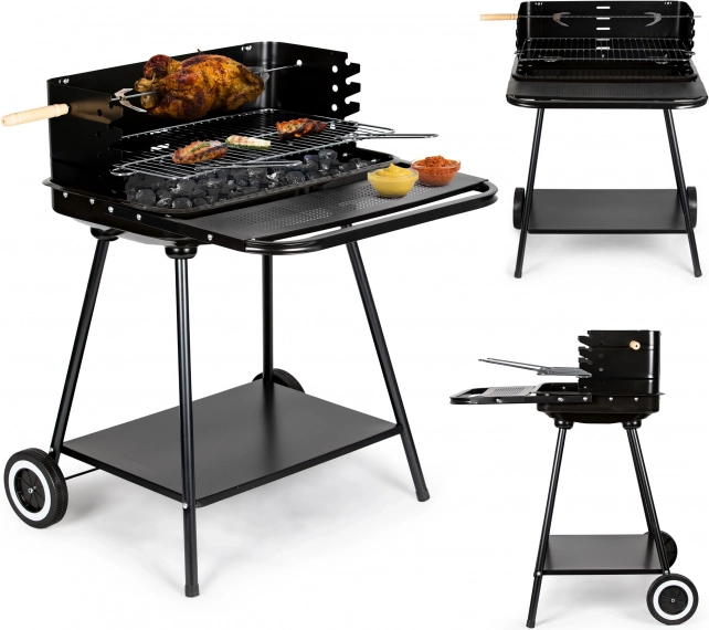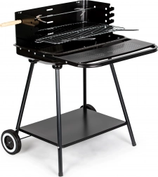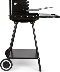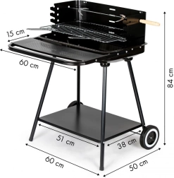 Ten grill jest wyposażony w kółka i uchwyt, które ułatwiają jego przenoszenie nawet w pełni rozgrzanym stanie. Dolna półka zapewnia miejsce na przechowywanie węgla lub innych akcesoriów grillowych.