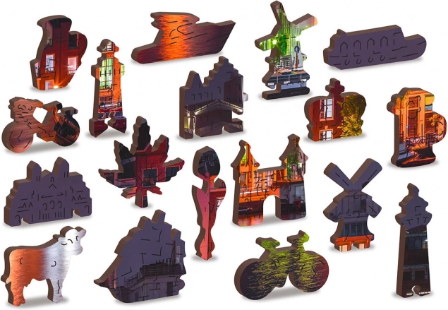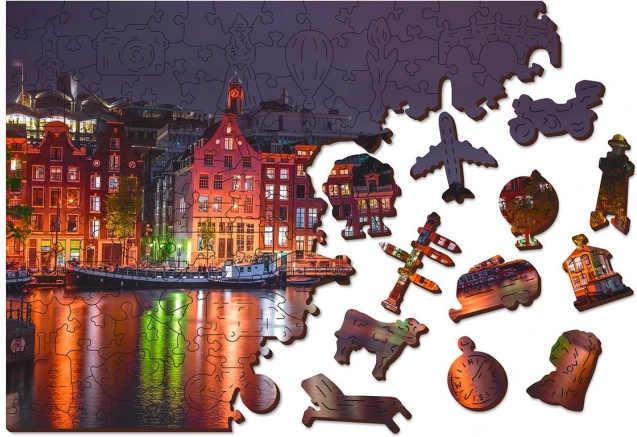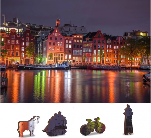 Te unikalne drewniane puzzle ucieszą każdego miłośnika układania. Dzięki laserowemu wycinaniu puzzle oferują gładkie krawędzie, które łatwo się łączą. Zawiera łącznie 150 elementów, z czego 30 ma unikalne kształty jak zwierzęta czy znane budowle, dodając edukacyjny element i jednocześnie wizualną estetykę. Puzzle są zaprojektowane jako 2w1, co oznacza, że można je układać według wyrafinowanego nocnego motywu Amsterdamu, jak i według wzoru na tylnej stronie.