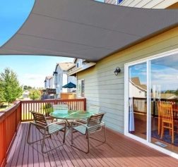 Płachta przeciwsłoneczna wykonana z materiału wysokiej jakości skutecznie blokuje promienie słoneczne i obniża temperaturę pod płachtą.