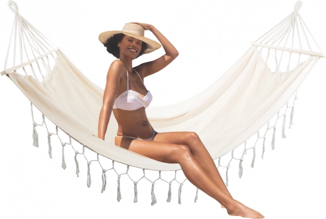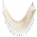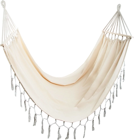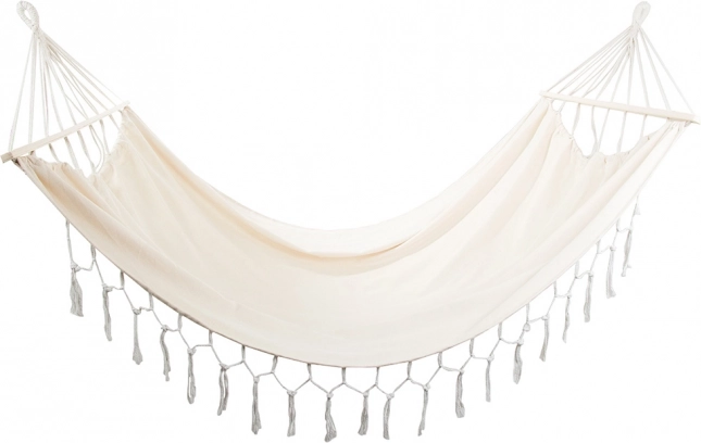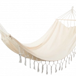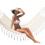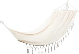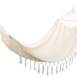 Ten hamak boho jest idealny dla par i singli, którzy cenią wygodę i styl. Szeroka powierzchnia leżenia z drewnianymi rozpórkami utrzymuje tkaninę ładnie rozpostartą, dzięki czemu wygodnie się ułożysz i zrelaksujesz w ogrodzie, na balkonie lub na wakacjach.