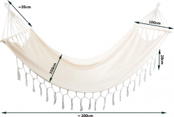 Ciesz się doskonałym relaksem na świeżym powietrzu w eleganckim hamaku boho dla dwóch osób. Dzięki przestronnej powierzchni 200 × 150 cm, udźwigowi do 200 kg oraz dekoracyjnym frędzlom oferuje stylowy komfort w ogrodzie, na tarasie i w domu. Wytrzymała tkanina, drewniane belki rozporowe oraz solidne liny zawieszające gwarantują stabilność i łatwy montaż.