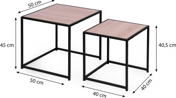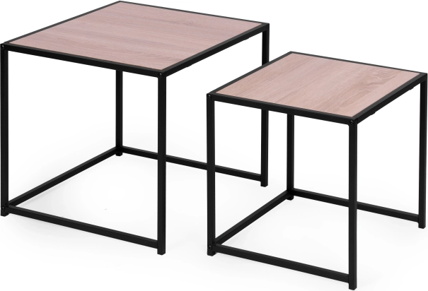 Stoliki posiadają stabilną metalową ramę z powłoką proszkową i blaty z płyty wiórowej z okleiną imitującą drewno. Powierzchnia jest odporna na zarysowania i zabrudzenia.