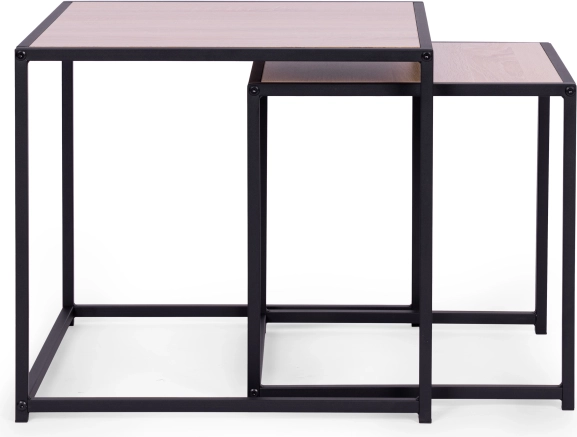 Stoliki mają stabilną, metalową ramę lakierowaną proszkowo. Blaty wykonane są z płyty wiórowej i pokryte okleiną imitującą jasnobrązowy drewniany wzór. Ich powierzchnia jest odporna na zabrudzenia i zarysowania oraz łatwa do czyszczenia.