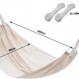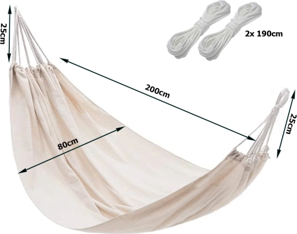 - Idealne wymiary: 200 × 80 cm (tkanina), całkowita długość z linkami ok. 250 cm.