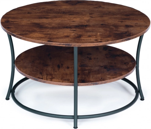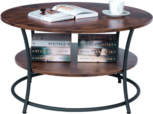 Stylowy okrągły stolik kawowy w stylu loft łączy drewno i metal w ponadczasowy element do nowoczesnych wnętrz. Ma dwie półki odkładcze w dekorze dębu rustykalnego, stabilną, malowaną proszkowo metalową ramę oraz regulowane stopki dla idealnego wypoziomowania i ochrony podłogi. Idealny do salonu i sypialni jako praktyczny i designerski dodatek.