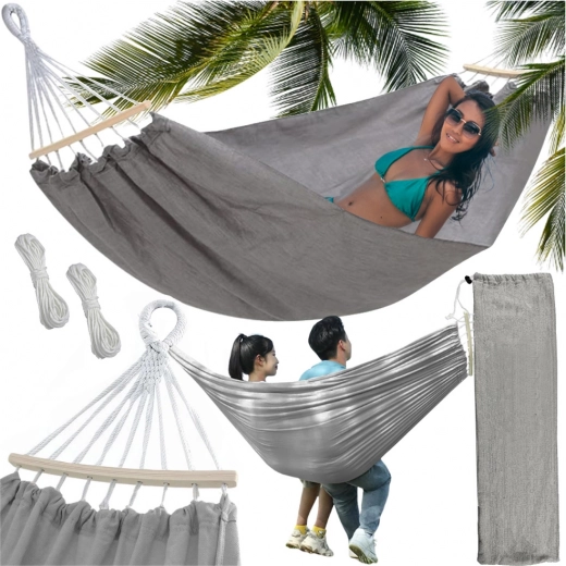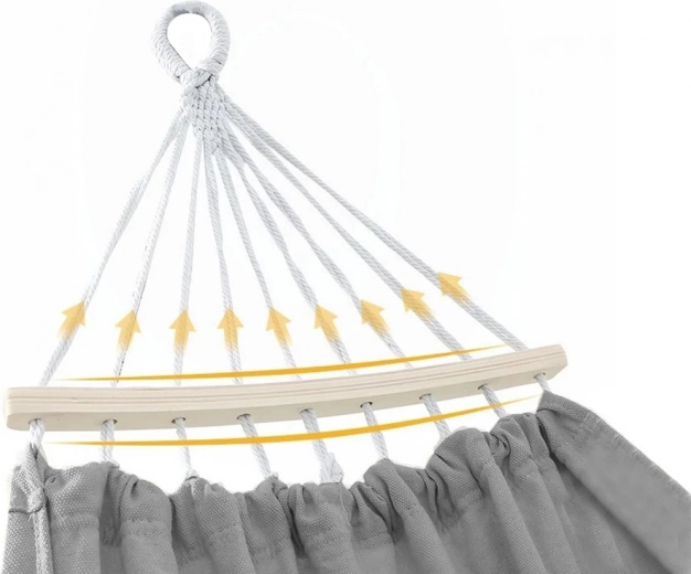 Ten przestronny hamak to świetny wybór do ogrodu, na taras i balkon. Podwójna konstrukcja oraz gęsto tkane sznury zapewniają wysoką nośność do 200 kg i przyjemne, bezpieczne bujanie. Oddychająca tkanina dba o komfort nawet w upalne dni, a daszek dodaje wygody i cienia.