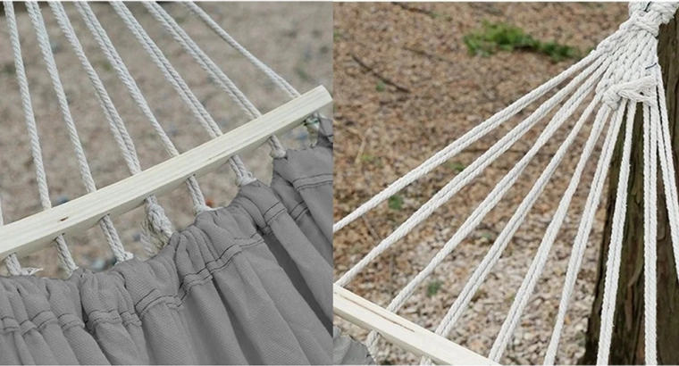 Montaż jest szybki i prosty – wystarczy przymocować oba końce do solidnych punktów, takich jak drzewa, słupki lub haki sufitowe. Po użyciu hamak łatwo schowasz do dołączonego pokrowca, dzięki czemu nie zajmuje dużo miejsca i jest gotowy na kolejne wyjazdy lub sezon.