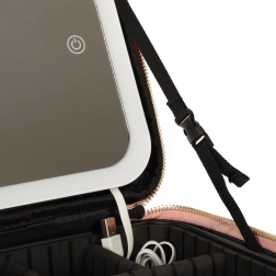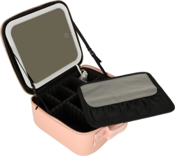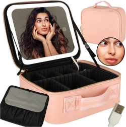 Różowy kuferek na kosmetyki idealnie sprawdzi się w podróży i na co dzień. Dzięki lusterku LED z dotykowym sterowaniem oraz lusterku powiększającemu 10× wykonasz makijaż precyzyjnie nawet w gorszych warunkach oświetleniowych. Wewnętrzne przestawne przegródki i kieszeń na pędzle czy pomadki utrzymają wszystko doskonale uporządkowane.