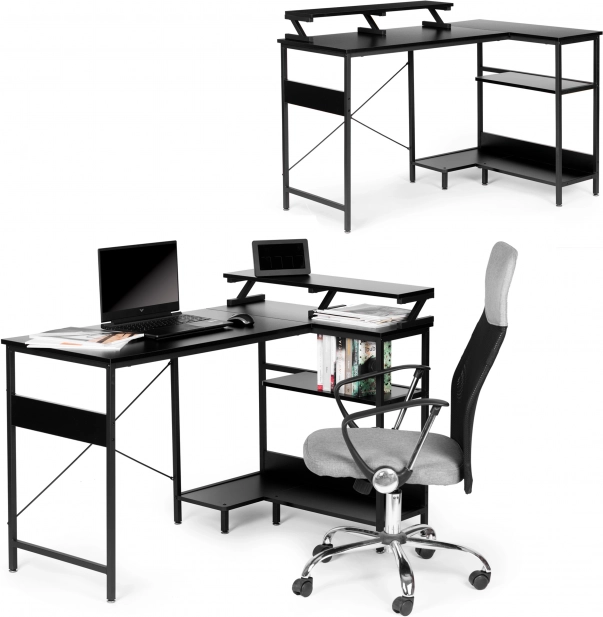Stwórz przejrzyste i ergonomiczne miejsce pracy. Narożne biurko ModernHome łączy przestronny blat z przemyślanymi rozwiązaniami do przechowywania, dzięki czemu nadaje się do biura, pokoju studenta i kącika gamingowego. Stabilna, malowana proszkowo metalowa rama oraz 18‑mm MDF z laminatem gwarantują długą trwałość i łatwą pielęgnację.