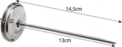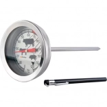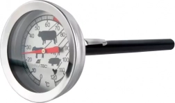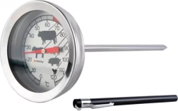 Termometr zawiera symbole z optymalnymi temperaturami dla różnych rodzajów mięsa oraz czytelną tarczę.