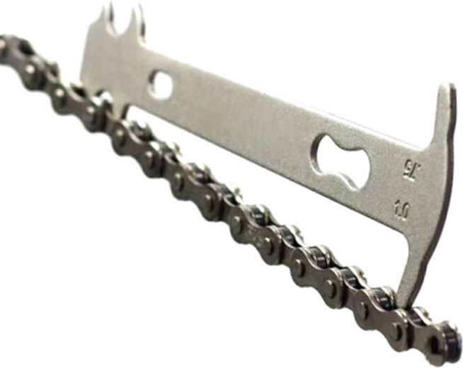 Kompaktowe narzędzie do kontroli stanu łańcucha rowerowego. Bardzo łatwe w użyciu – wystarczy włożyć zaokrąglony koniec miernika w ogniwo łańcucha, a drugi koniec oprzeć o napięty łańcuch. Miernik pokazuje stopień zużycia na skali 75% i 100%. Jeśli koniec miernika nie wchodzi między ogniwa, oznacza to, że łańcuch jest w idealnym stanie.