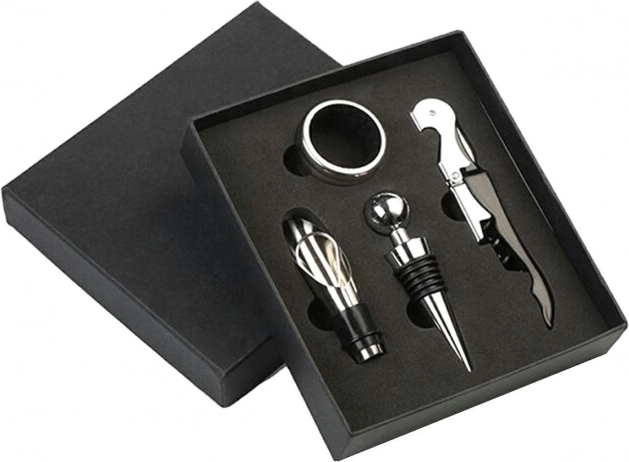 Wysokiej jakości zestaw do wina (4 elementy) zapakowany w estetyczne pudełko. Zawiera wszystkie najczęściej używane akcesoria do wina – przydatny w każdym domu.