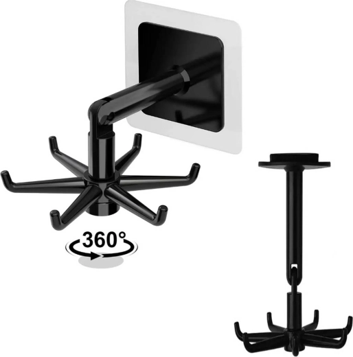 Samoprzylepny kuchenny haczyk z sześcioma haczykami na obrotowym wieszaku. Łatwy, nieinwazyjny montaż dzięki taśmie klejącej umożliwia instalację haczyka zarówno pod szafką, jak i na ścianie.