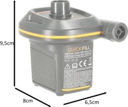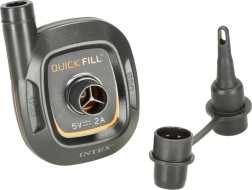 Kompaktowa elektryczna pompka INTEX Quick-Fill na USB 5V/2A szybko napompuje i wypuści powietrze z materacy, kół basenowych oraz innych dmuchanych produktów. Oferuje dwukierunkową pracę, wysoką wydajność 150 l/min oraz uniwersalne końcówki do różnych zaworów. Dzięki niewielkim wymiarom idealnie sprawdzi się w podróży i może być zasilana z ładowarki, powerbanku lub dowolnego portu USB.