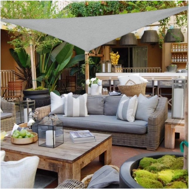 Trójkątna płachta 3 × 3 × 3 m tworzy przyjemny cień dla strefy wypoczynkowej, kącika jadalnianego i zabaw dzieci, skutecznie chroniąc przed szkodliwym promieniowaniem UV.